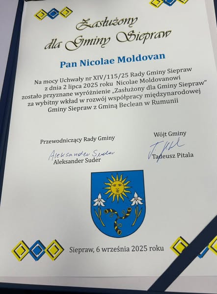 Recunoașterea vine ca o apreciere pentru contribuția sa la consolidarea colaborării între orașul Beclean și Siepraw, un parteneriat care a evoluat de-a lungul decadelor din relații oficiale în adevărate legături de prietenie.