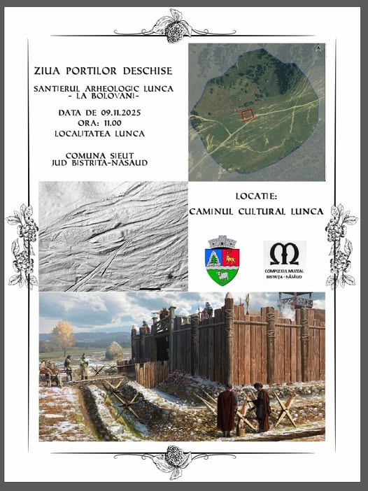 Complexul Muzeal Bistrița-Năsăud, în parteneriat cu Primăria comunei Șieuț, organizează duminică, 9 noiembrie 2025, începând cu ora 11:00, la Căminul Cultural din localitatea Lunca (comuna Șieuț), evenimentul „Ziua Porților Deschise – șantierul arheologic Lunca – La Bolovani”.