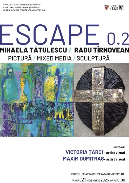 Vineri, 21 noiembrie 2025, începând cu ora 18:00, Muzeul de Artă Comparată Sângeorz-Băi găzduiește vernisajul expoziției „Escape 0.2”, semnată de artiștii vizuali Mihaela Tătulescu și Radu Tîrnovean, curator fiind Victoria Țăroi.