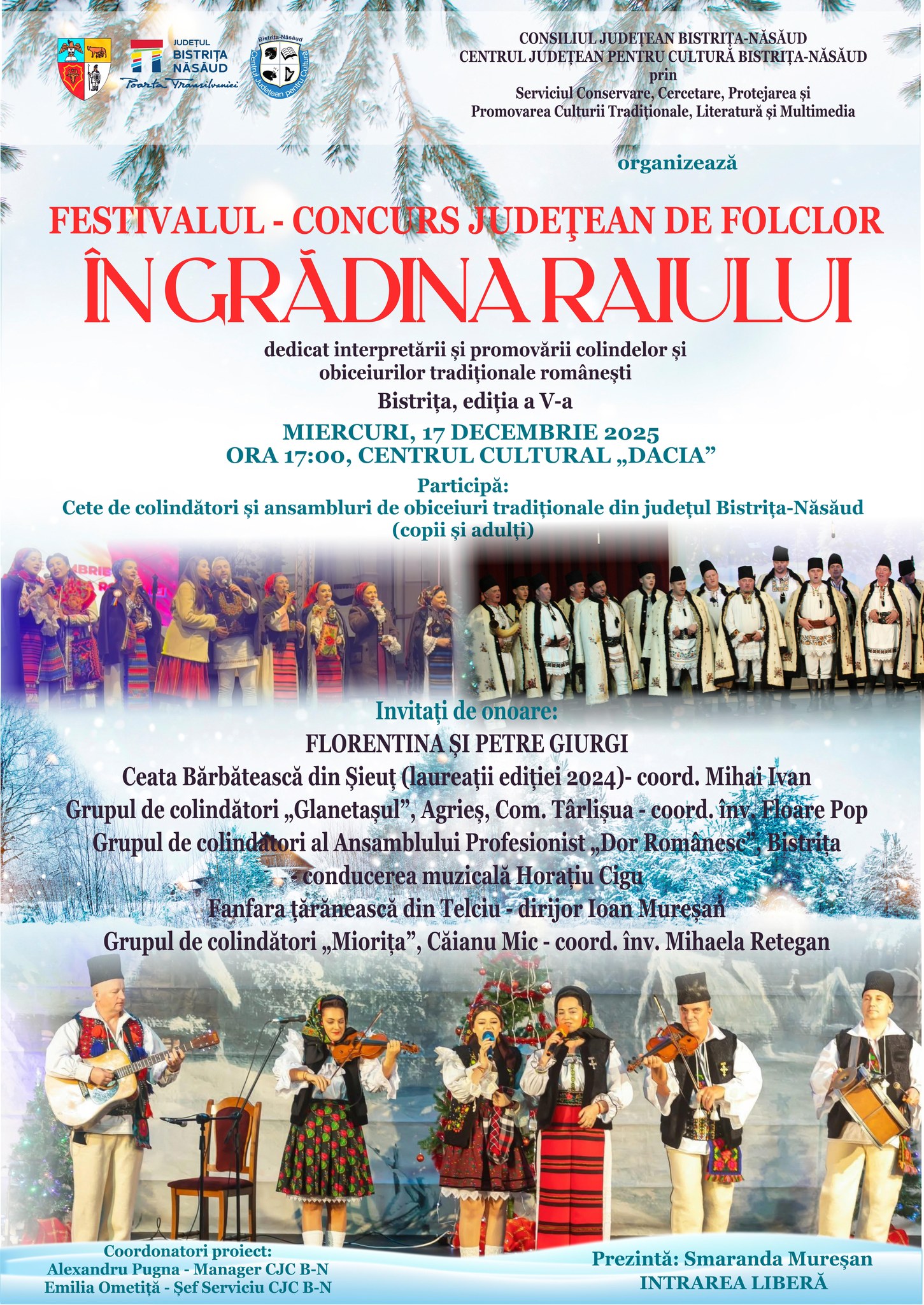 Centrul Județean pentru Cultură Bistrița-Năsăud anunță organizarea celei de-a cincea ediții a Festivalului–Concurs Județean de Folclor „În Grădina Raiului”, un eveniment dedicat colindelor și obiceiurilor tradiționale românești. Manifestarea va avea loc miercuri, 17 decembrie 2025, de la ora 17:00, la Centrul Cultural „Dacia” din Bistrița, iar accesul publicului este gratuit.