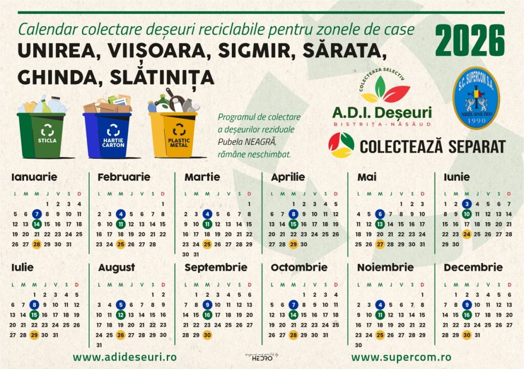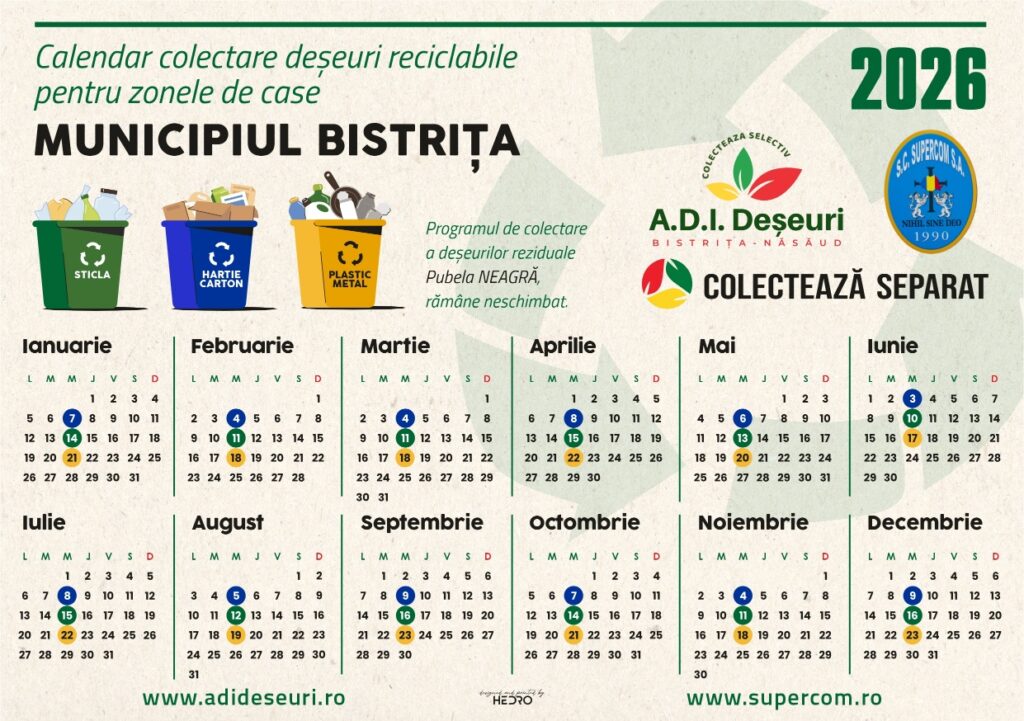 Pentru informații detaliate despre calendarul de colectare în fiecare localitate din județul Bistrița-Năsăud, cetățenii pot accesa site-ul www.adideseuribn.ro sau pot suna la Dispeceratul Supercom – 0263 944.
