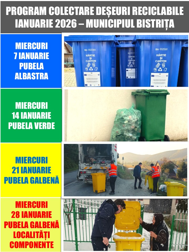 Programul de colectare a deșeurilor reciclabile în Municipiul Bistrița și localitățile componente începe în luna ianuarie 2026 din prima săptămână completă, mai exact din 5 ianuarie 2026, potrivit calendarului anunțat de operatorul de salubritate.
