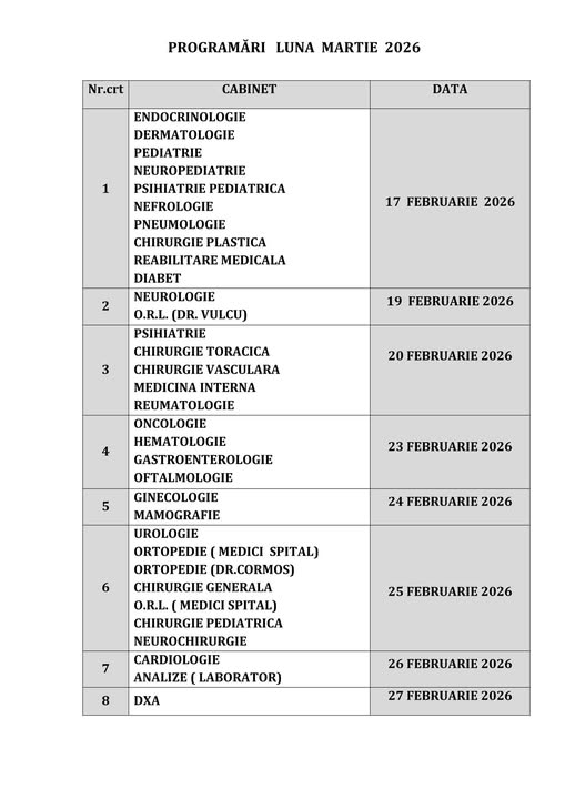 Policlinica Bistrița anunță datele și modalitățile prin care pacienții se pot programa pentru consultații și investigații în luna martie 2026, în cadrul specialităților medicale și paraclinice.