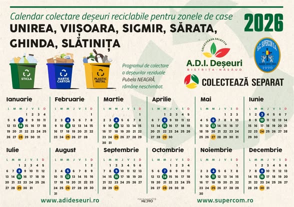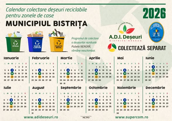 Pentru detalii privind calendarul complet de colectare a deșeurilor în fiecare localitate din județul Bistrița-Năsăud, cetățenii pot consulta site-ul ADI Deșeuri Bistrița-Năsăud sau pot apela Dispeceratul Supercom, la numărul de telefon 0263.944.