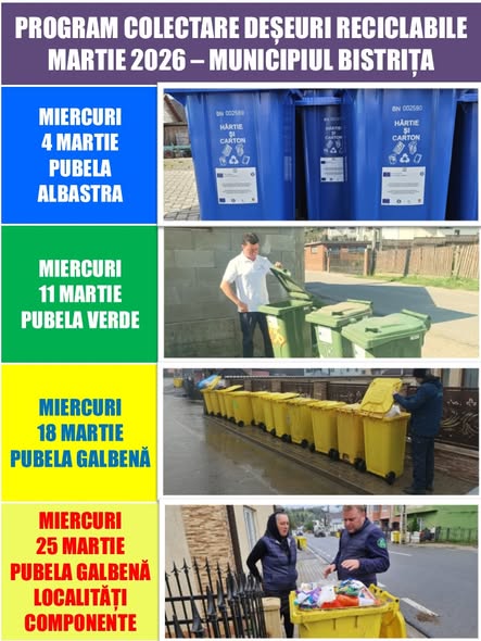 Locuitorii municipiului Bistrița și ai localităților componente – Unirea, Viișoara, Sărata, Sigmir, Ghinda și Slătinița – sunt informați cu privire la programul de colectare a deșeurilor reciclabile aferent lunii martie 2026.